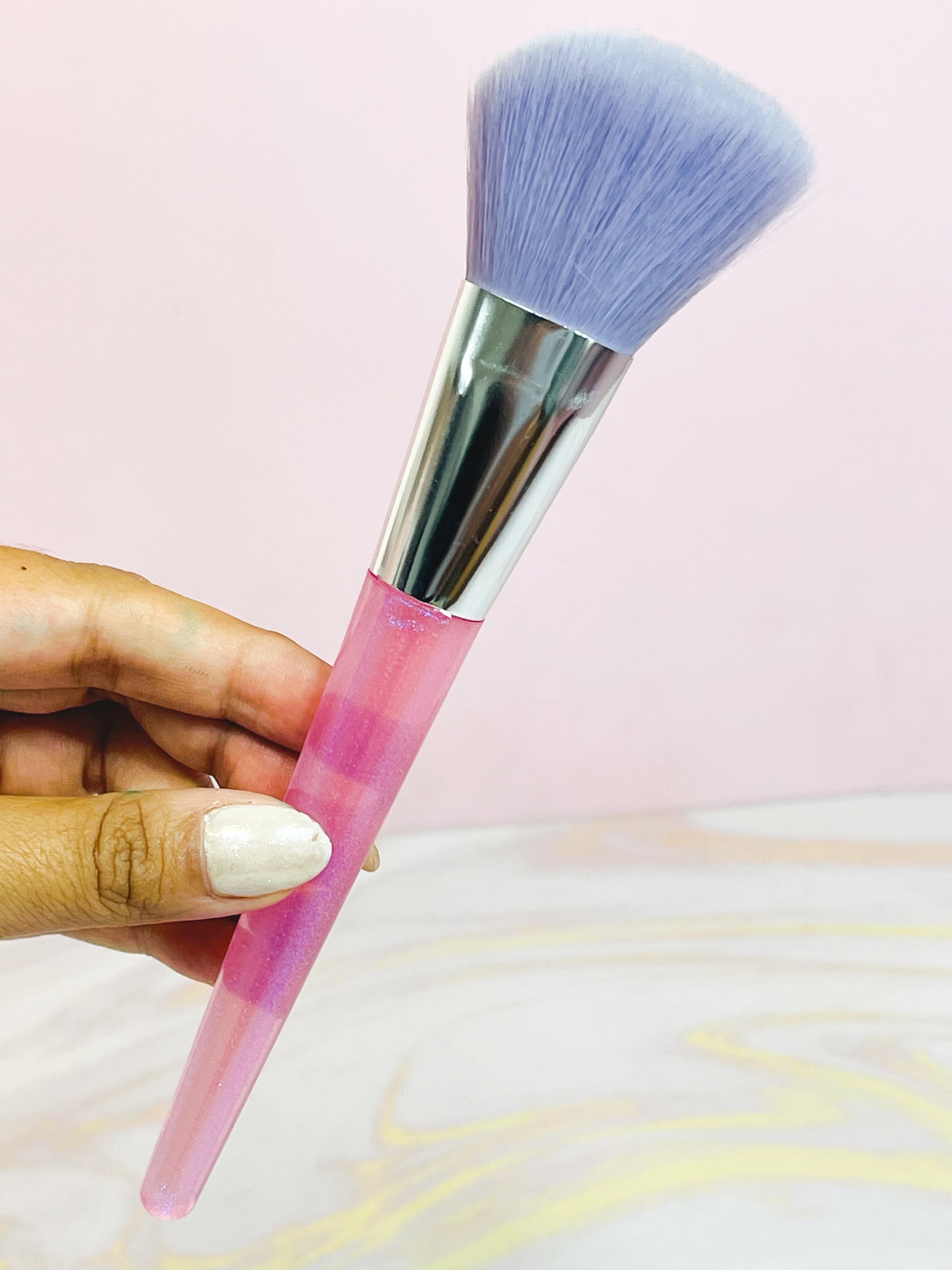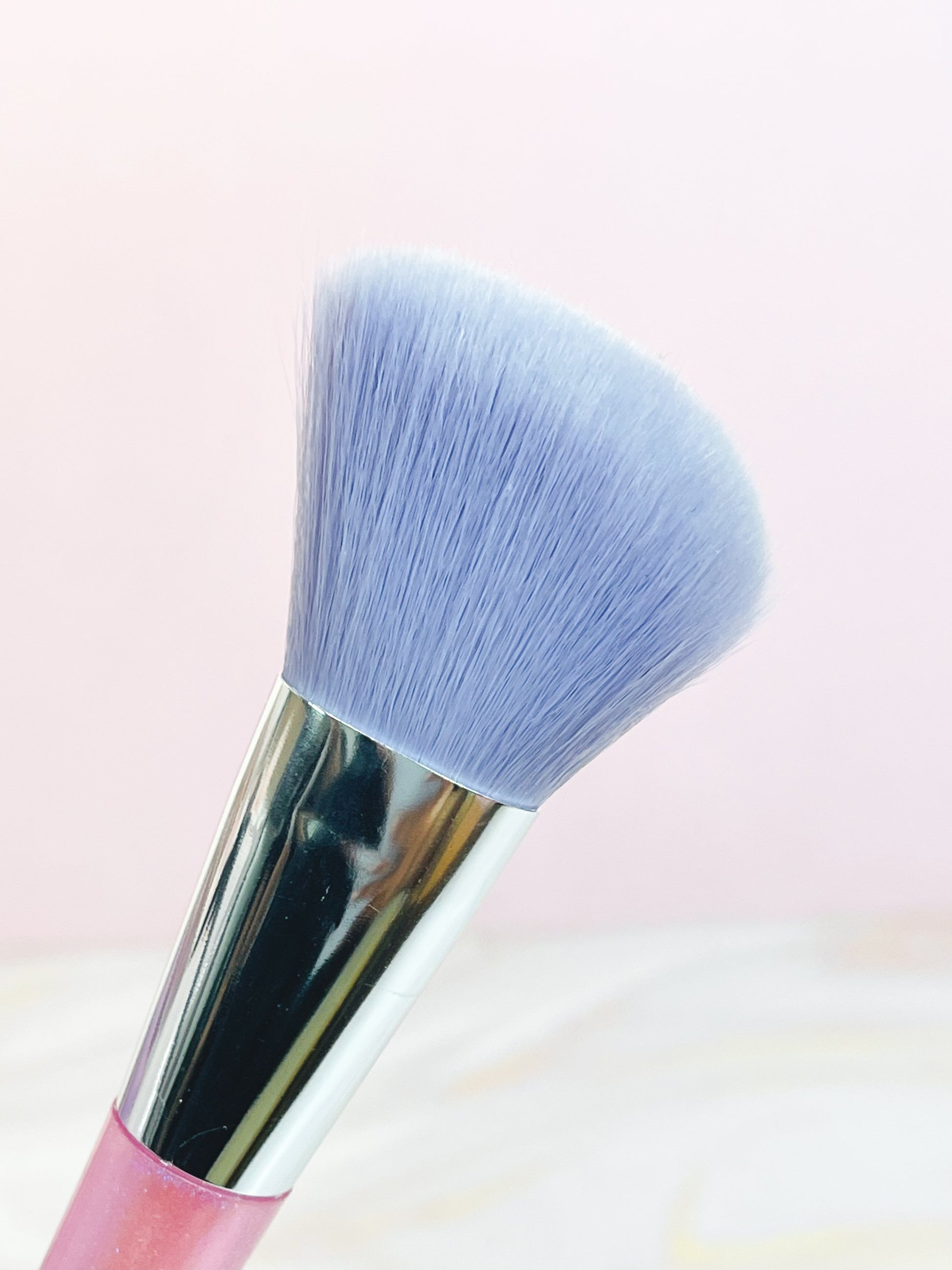 Brocha angular de cerdas suaves y mango escarchado, ideal para aplicar rubor y contorno con precisión.