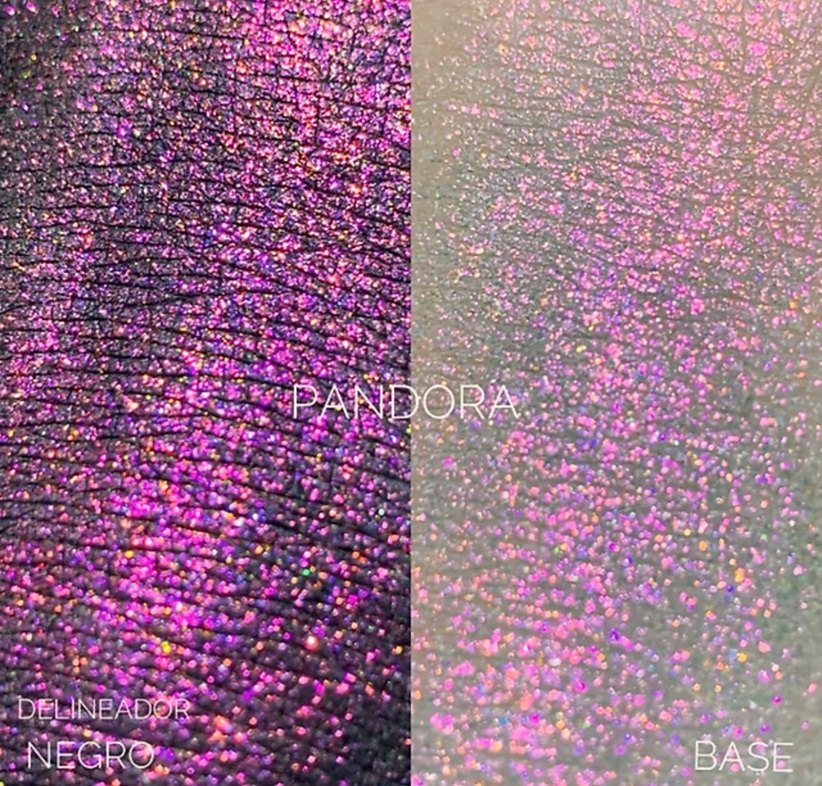 Glitter duocromatico micro pulverizado ,que con diferentes ángulos de luz reflejara un color diferente al que se ve en el envase.